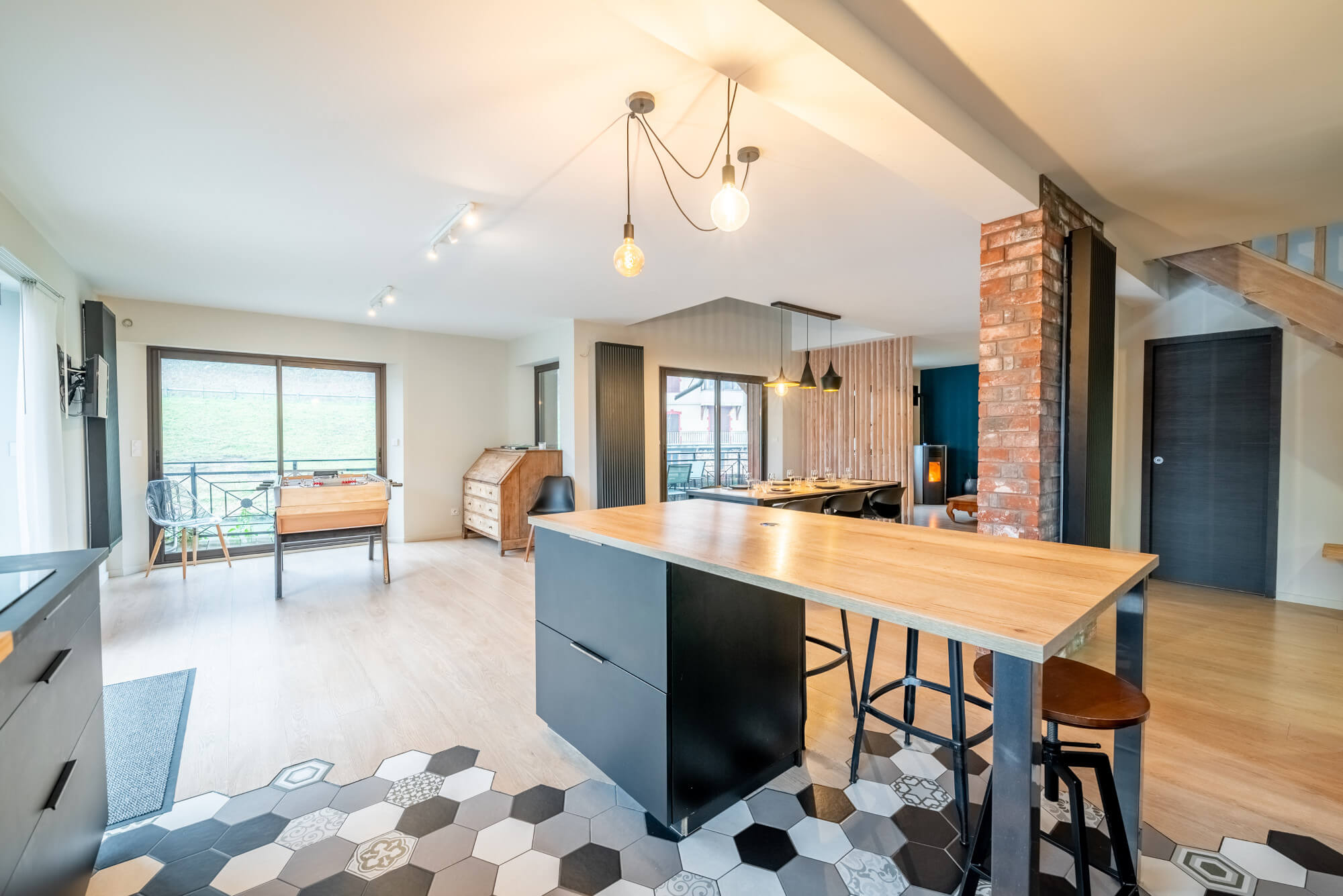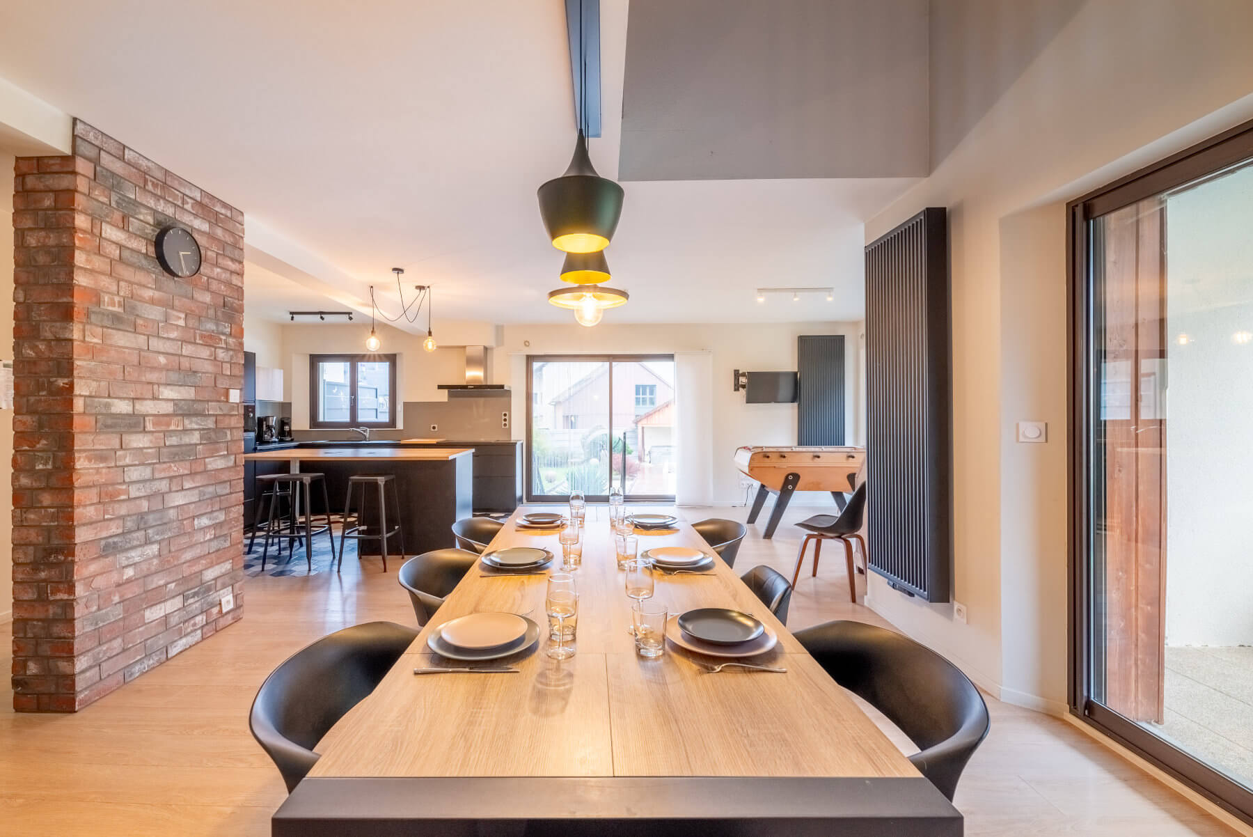 La maison, entièrement rénovée, combine confort et ambiance chaleureuse. Elle accueille jusqu’à 11 personnes avec trois chambres doubles (certaines équipées de lits simples supplémentaires), une mezzanine, et deux salles de bain. La cuisine, parfaitement équipée (raclette, fondue, crêpière, Senseo et cafetière filtre, four, micro-ondes), s’ouvre sur un salon convivial avec deux télévisions, un baby-foot et une enceinte Bluetooth.